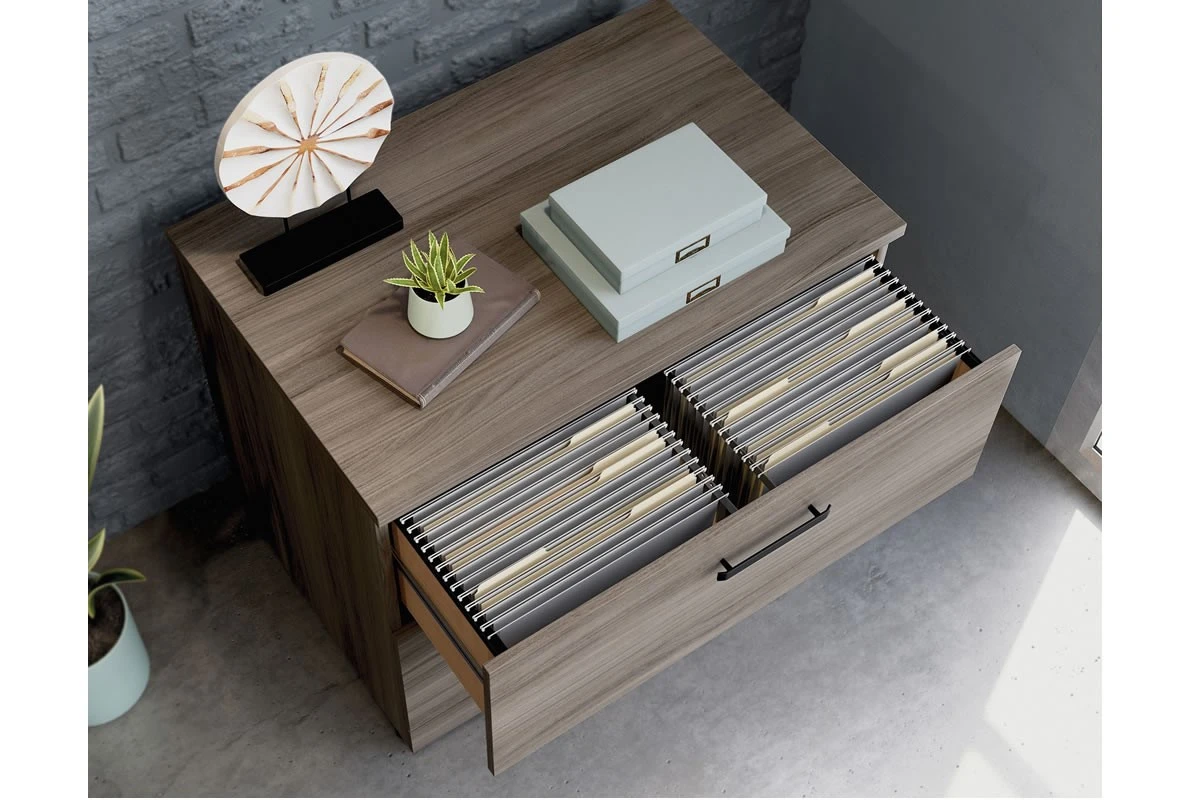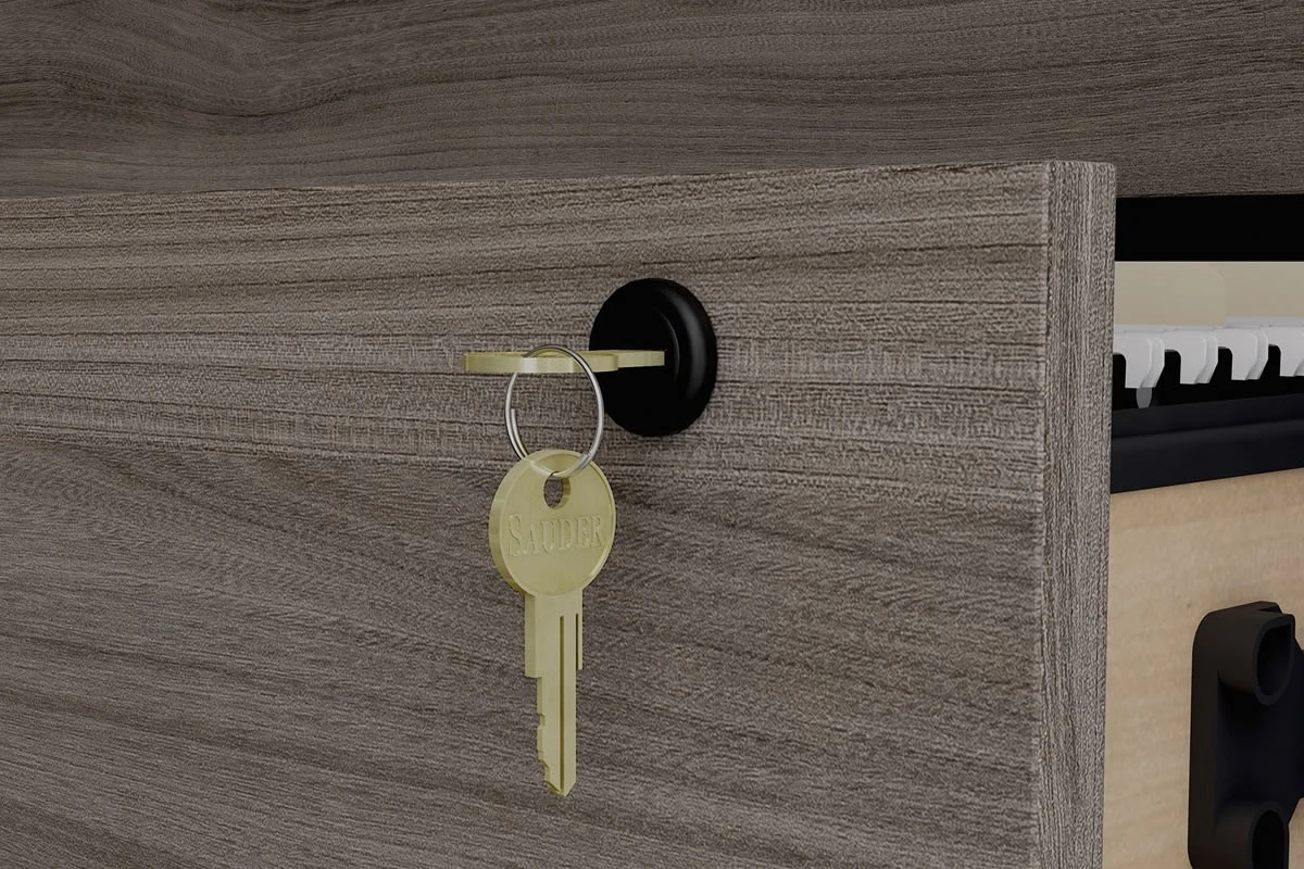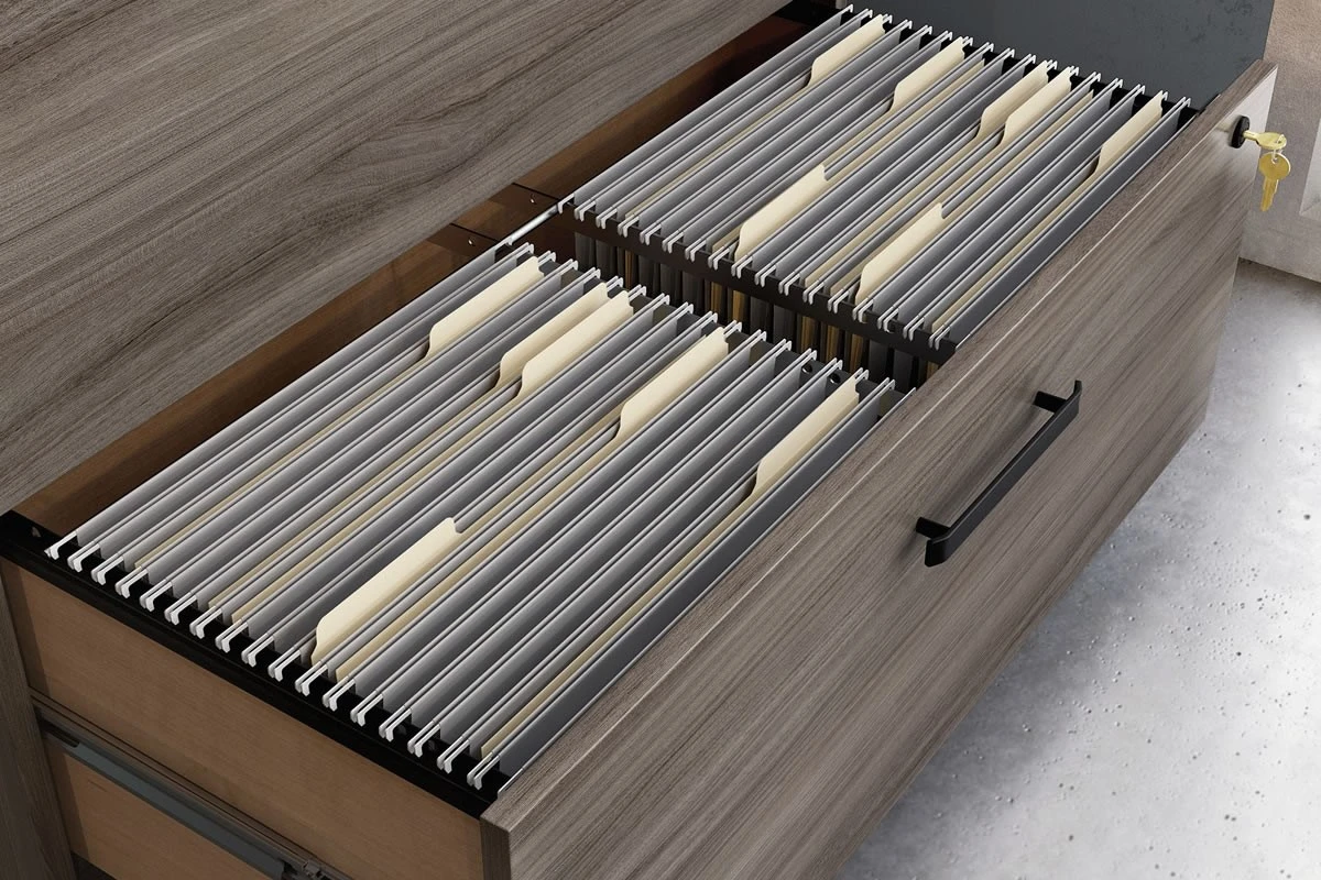 Keep your files secure and organized with the Affiliate Lateral Filer. This sleek and strong piece of furniture has two lockable drawers that can store your letter, legal or European-size hanging files. The drawers have full extension slides that allow you to access your files easily and smoothly. The filer also has metal-to-metal fixings that ensure its rigidity and reliability.