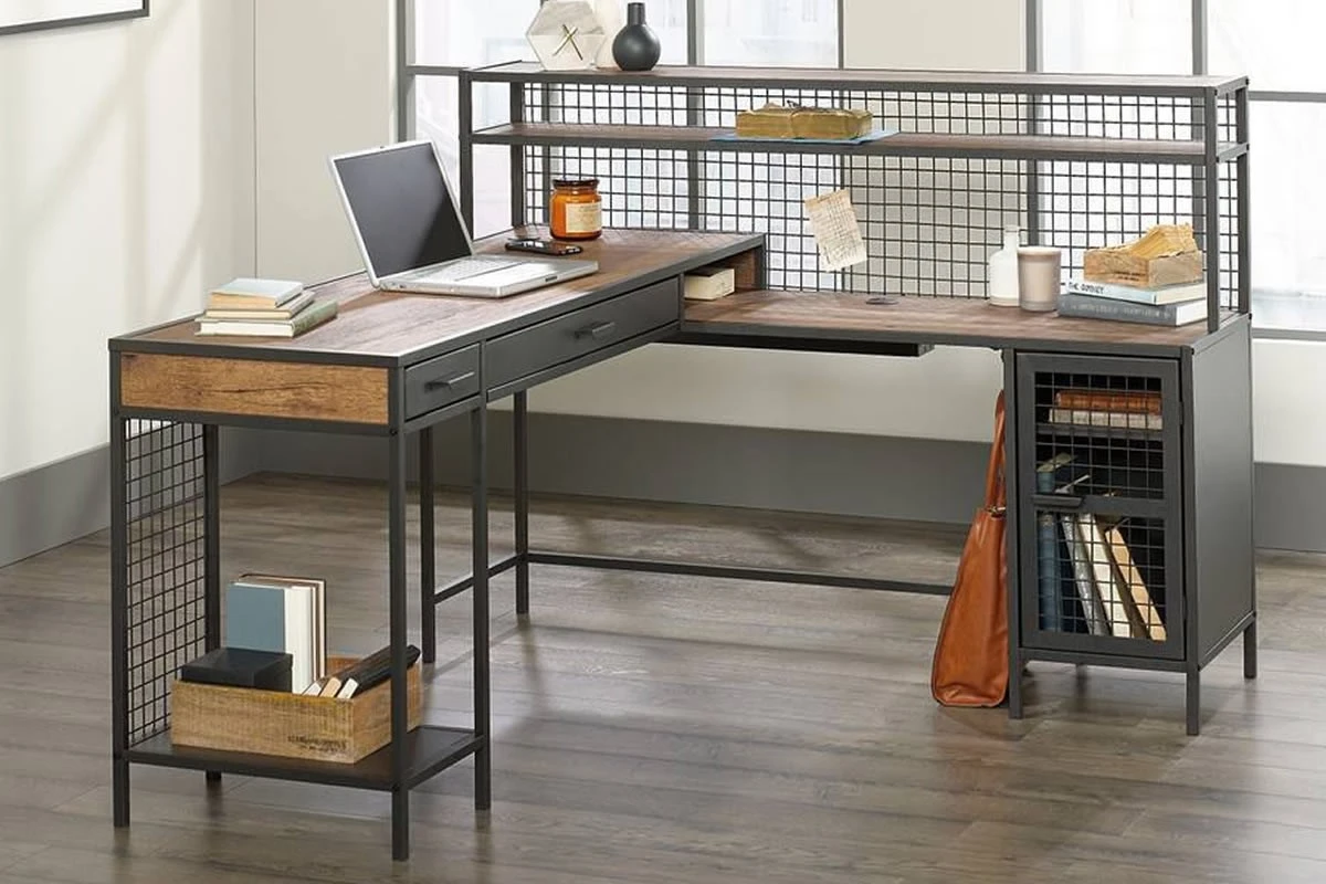 - Contemporary home office L-shaped desk in Vintage Oak finish and modern black accents