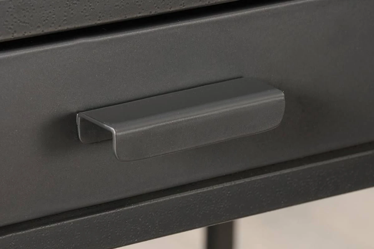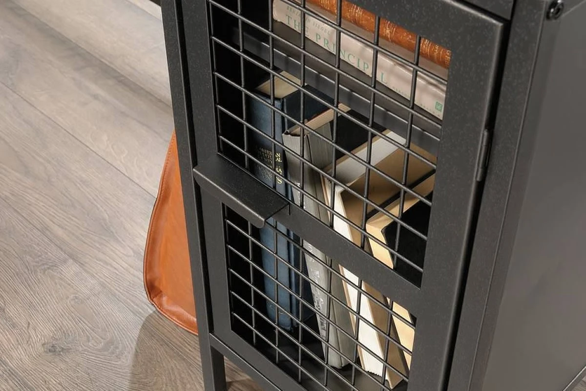 There are two storage drawers with full extension slides to stash all manner of desking stationery as well as an adjustable shelf discreetly hidden behind a metal door with a wire mesh front, all finished in sleek black.