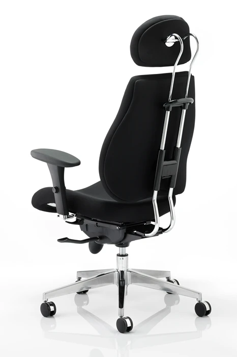 The backrest is fully adjustable in height and is fitted with contoured lumbar cushioning. Mounted onto the backrest is an adjustable headrest ensuring the correct neck and spinal support.