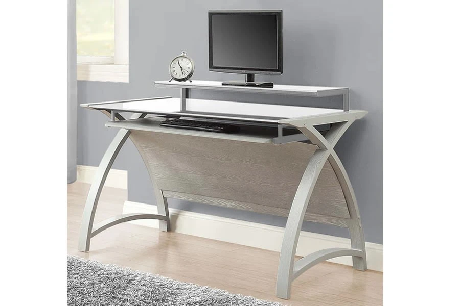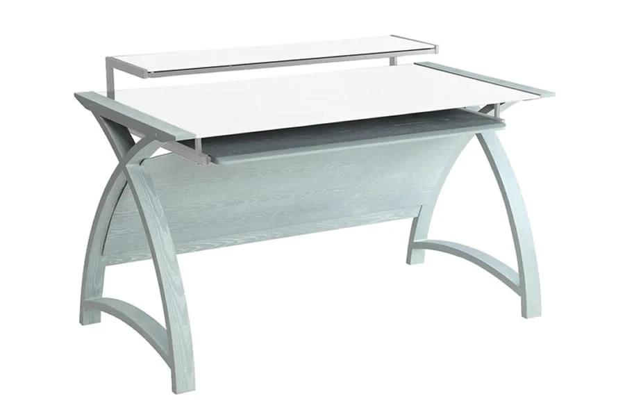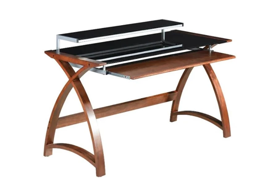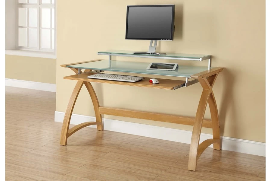 Transform your home office into a stylish and productive space with this minimalistic desk. This desk features our popular curved wood design that showcases the natural beauty of wood and adds a touch of sophistication to your decor. The desk is finished with an ultra glass surface that is smooth and easy to clean. The desk also includes a sliding keyboard tray that helps you save space and keep your work area organized.