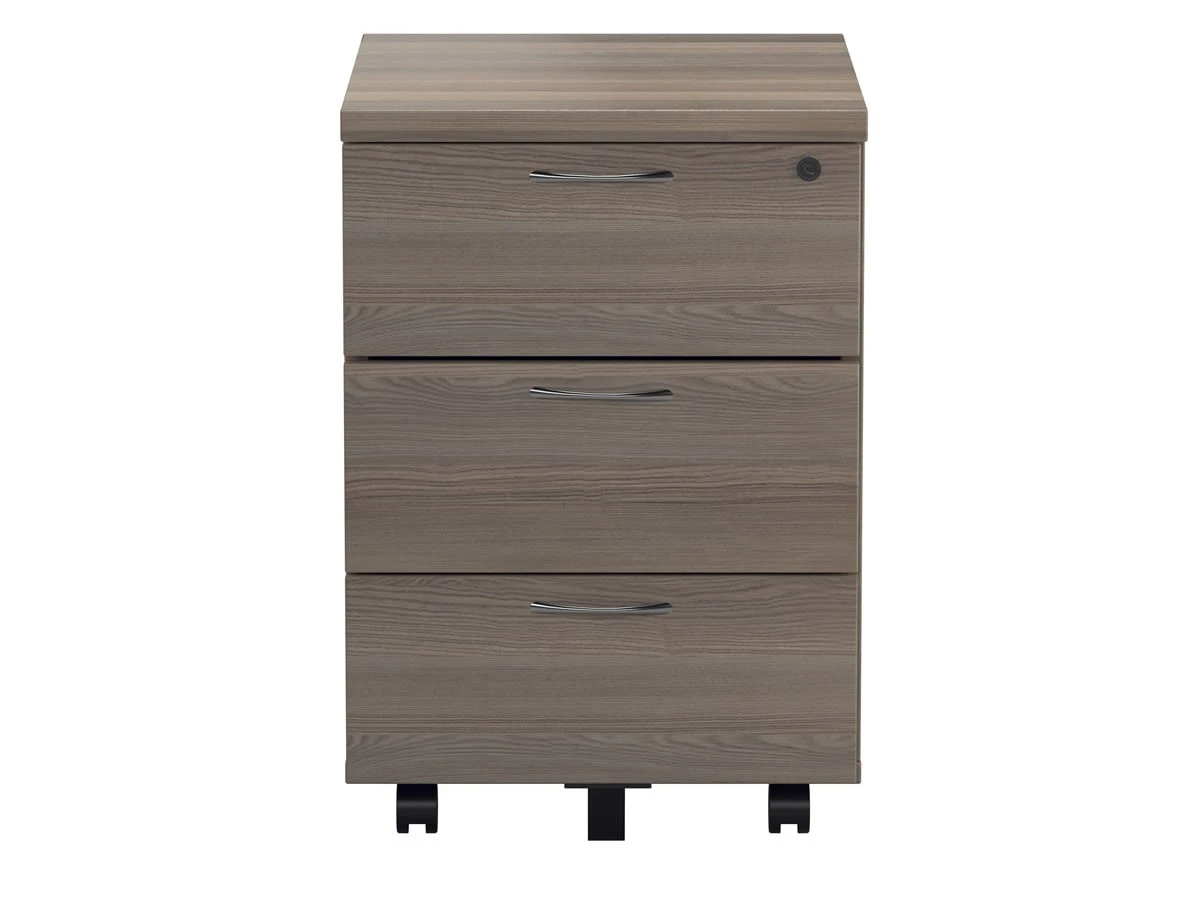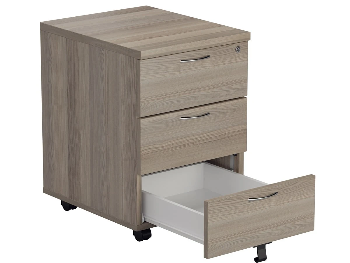 The Kestral mobile pedestal chest is also durable and easy to maintain. The carcass and top are made of 18 mm thick MFC material that can withstand daily wear and tear. The drawers are fitted with metal runners that ensure smooth and quiet operation. The pedestal is finished in a grey oak MFC wipe-able finish that gives it a sleek and modern look.