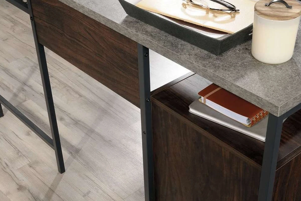 - Contemporary home office L-shaped desk in Rich Walnut finish with Slate Grey accents