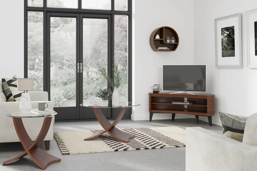 The Siena Coffee Table has a clear toughened glass top that is bevelled at the edges for a sleek and smooth look. The glass top reflects light and creates a sense of spaciousness in your room. The glass top rests on sweeping veneered legs that are curved and elegant. The legs come in three different finishes: grey, oak or walnut. You can pick the one that suits your taste and complements your decor. The legs are also connected by modern chrome discs that add a touch of shine and contrast to the table.