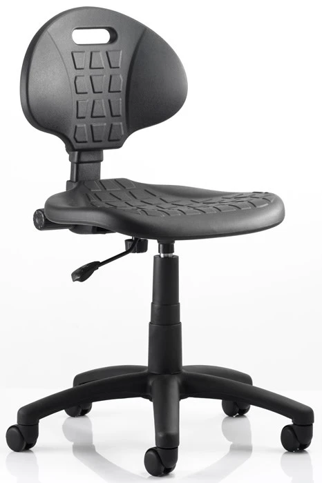 Polyurethane chair with gas seat height adjustment and hinged tilt backrest. Easy to clean soft polyurethane seat designed for areas such as vets surgery, industrial stores departments, ticket offices, manufacturing facility and health applications.